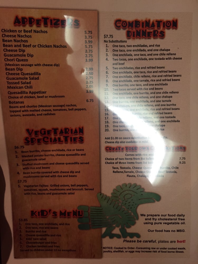 1 taco, 1 enchilada, rice or beans.Chicken or ground beef